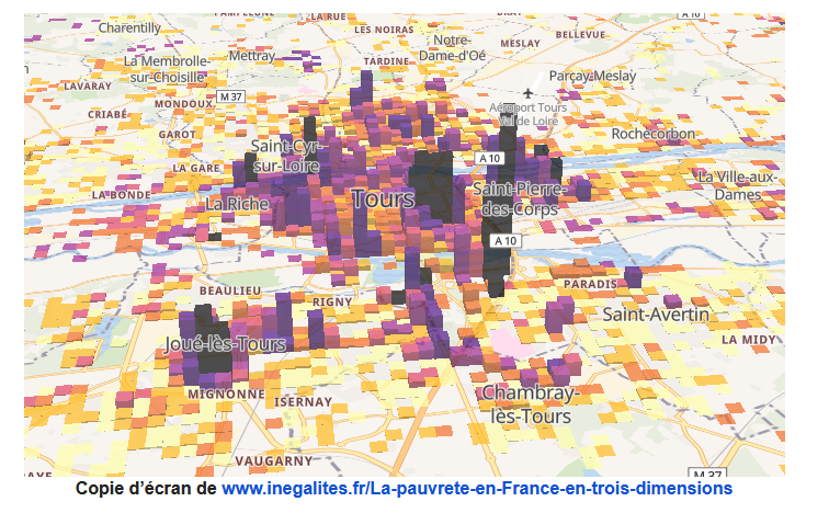 Les données de l’Insee contredisent depuis des années la thèse d’une France abandonnée vivant au loin des villes. C’est surtout au sein de ces dernières que vivent les plus démunis. L’étude des niveaux de vie occulte souvent l’effet de la densité de population. Pour le visualiser, on peut utiliser l’outil mis en place par l’Observatoire des inégalités, qui permet de mesurer le nombre de ménages pauvres à partir de carrés de 200 mètres de côté.