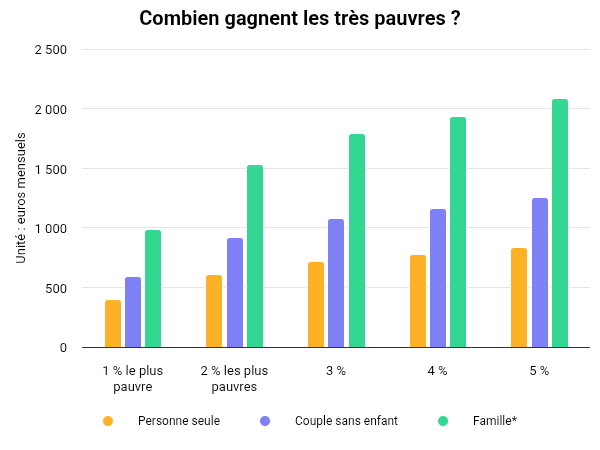 L’Insee ne diffuse malheureusement pas de données sur les revenus les plus faibles, mais l’institut européen Eurostat le fait. Selon l’organisme, le 1 % le plus pauvre – environ 600 000 personnes – vivrait avec moins de 400 euros par mois pour une personne seule en France, l’équivalent de 600 euros pour un couple et de 1 000 euros pour un couple avec deux adolescents. Les seuils des 5 % les plus modestes se situeraient respectivement à 840, 1 250 et 2 100 euros selon la composition de la famille. Et encore, on ne tient compte ici que des personnes disposant d’un logement et qui résident en France métropolitaine.