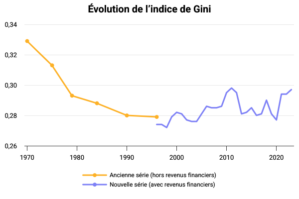 Lecture : en 2023, l'indice de Gini des niveaux de vie est de 0,297.