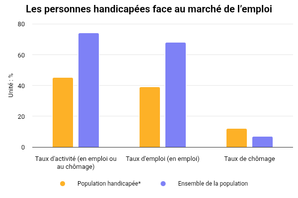 12 % des personnes reconnues handicapées étaient au chômage en 2023, 1,7 fois plus que la moyenne nationale. Près des deux tiers des travailleurs handicapés sont employés et ouvriers, contre à peine la moitié de la population en emploi.