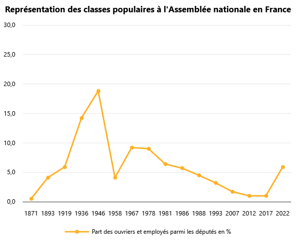 Par la suite, la représentation des catégories populaires n’a cessé de se réduire, alors que cet ensemble constitue toujours environ la moitié de la population active. Seuls 1 % des députés sont ouvriers ou employés en 2012. On note une légère remontée en 2022, où leur part atteint 6 %.