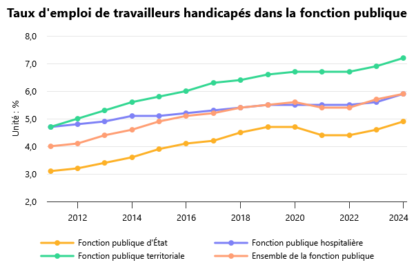https://www.inegalites.fr/Fonction-publique-des-progres-notables-dans-l-emploi-de-travailleurs-handicapes - Reproduction interditeLa fonction publique compte 5,9 % [1] de travailleurs handicapés parmi ses agents en 2024, selon les données de la Caisse des Dépôts. Il aura donc fallu attendre près de deux décennies pour que l’obligation d’employer 6 % de travailleurs handicapés, inscrite dans la loi en 2006, soit respectée. Un progrès notable : la proportion n’était que de 4,6 % en 2014.