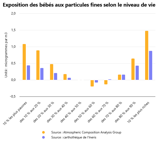 https://www.inegalites.fr/Les-enfants-de-familles-aisees-sont-plus-exposes-a-la-pollution-mais-leur-sante - Reproduction interditeLes jeunes enfants de familles favorisées respirent un air de moins bonne qualité, davantage composé de particules fines [1], que les enfants des classes moyennes et modestes, selon le ministère de la Santé [2]. Mais parce qu’ils sont en meilleure santé, ils sont moins affectés par la pollution. Pour établir ce constat, le ministère a observé l’exposition aux particules fines (qui affectent les bronches et peuvent notamment causer de l’asthme) des enfants nés en 2016 en fonction du niveau de vie de leur famille comparé au revenu médian de la population. Les enfants dont les parents sont les plus aisés sont les plus touchés : selon les données de l’Institut national de l’environnement industriel et des risques (Ineris), par exemple, les 10 % les plus favorisés ont une exposition supérieure de 0,88 microgrammes par m3 à celle des enfants des classes moyennes [3]. Les enfants les plus pauvres respirent en moyenne 0,44 microgramme par m3 de plus que ceux des classes moyennes. L’exposition des enfants résulte de leur lieu de vie : ceux des catégories supérieures sont davantage exposés car ils habitent plus souvent dans les grandes métropoles, là où l’air est le plus pollué. Les enfants des catégories modestes y vivent moins souvent, mais quand ils y habitent, c’est dans les communes les plus polluées. Enfin, ceux des classes moyennes résident plus fréquemment dans l’espace périurbain, là où l’air est plus respirable.