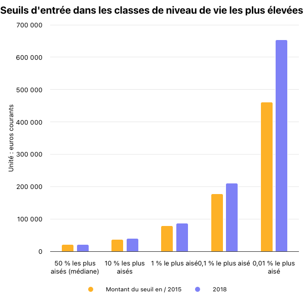 Lecture : en 2018, on appartient au 0,01 % le plus riche en France si on gagne au moins 653 960 euros par an après impôts. En 2015, il fallait gagner au moins 461 800 euros pour appartenir à cette classe de revenus.