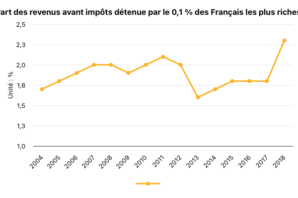 Malheureusement, sur cet indicateur, on ne sait pas ce qui s’est passé pour le 0,01 %. Mais les résultats restent impressionnants : la part des revenus déclarés détenue par le 0,1 % le plus aisé [les 63 000 personnes les plus riches] est ainsi passée de 1,7 % en 2004 à 2,3 % en 2018. La hausse est notamment très forte entre 2017 et 2018 (+ 0,5 point de pourcentage).