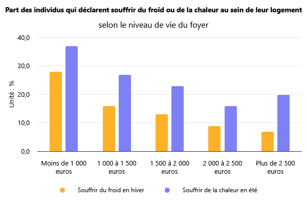 https://www.inegalites.fr/Logement-inegalites-environnementales - Reproduction interdite28 % des personnes qui ont un niveau de vie inférieur à 1 000 euros par mois disent souffrir du froid en hiver dans leur logement, contre 7 % de celles qui disposent de plus de 2 500 euros, soit quatre fois plus, selon une étude de l’Ademe [1]. En été, 37 % des ménages les plus modestes déclarent y endurer une chaleur excessive, deux fois plus que les ménages les plus aisés. Le niveau de vie est un élément déterminant du confort au sein du logement.