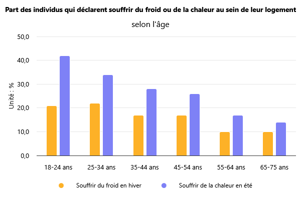 Le revenu n’est pas le seul facteur qui fait varier l’inconfort thermique des logements. Ainsi, 42 % des 18-24 ans déclarent souffrir de la chaleur en été dans leur habitation et 21 % du froid en hiver, contre respectivement 14 % et 10 % pour les 65-75 ans. Une situation qui s’explique par le fait que les jeunes vivent plus souvent en ville, dans des logements davantage exigus.