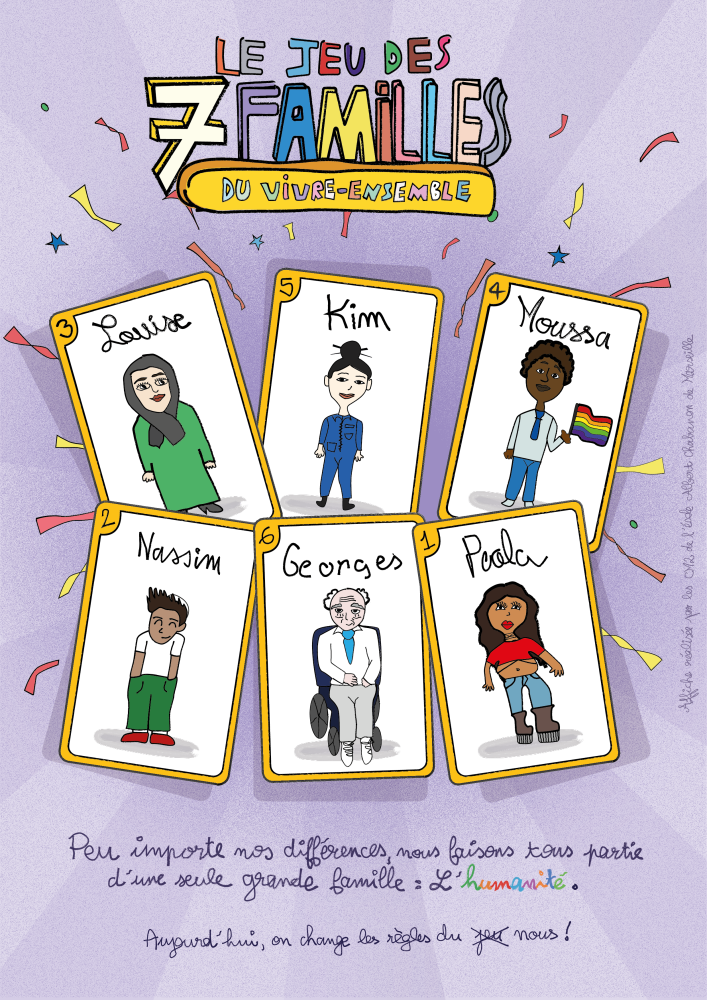 « Jeu des 7 familles du vivre ensemble » réalisée par Alma, Amin, Adam, Yasmine, Rukiia, Sarah, Serena, Snaïf, Yamina, Manal et Ibrahim (école Albert Chabanon et association Because U Art, Marseille).