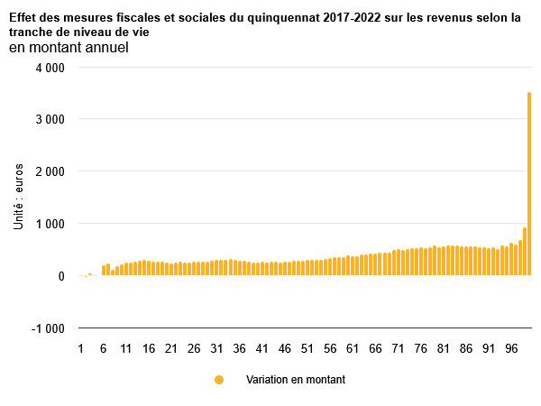 En euros, plus on est aisé, plus on a bénéficié des réformes, toujours selon cette étude. Pour les personnes situées parmi les 5 % les plus pauvres, l’effet des mesures gouvernementales est d’un montant proche de zéro. Entre les 6 % les plus pauvres et le milieu de l’échelle des revenus (environ 1 800 euros par mois après impôts pour une personne seule), l’amélioration est un peu plus sensible, aux alentours de 200 euros annuels. Dans le tiers supérieur, le gain est d’environ 500 euros annuels. Pour le 1 % du haut, c’est 3 500 euros de plus.