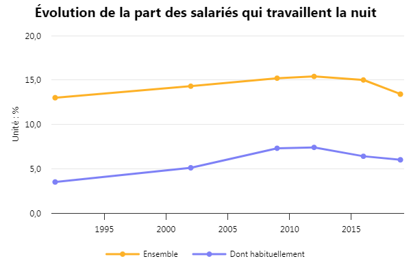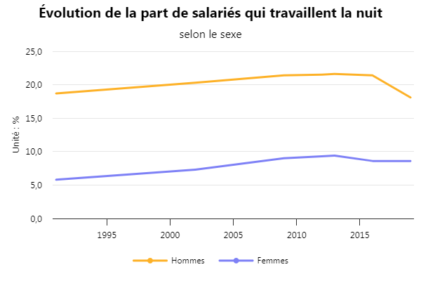 Au début des années 1990, 3,5 % des salariés travaillaient habituellement de nuit. Cette part a doublé en 2012 pour atteindre 7 %. Depuis 2012, le taux est descendu pour atteindre 6 % en 2019. La baisse s’explique quasi intégralement par la diminution du travail nocturne des hommes, car chez les femmes le taux est resté stable autour de 9 % (en incluant le travail de nuit occasionnel). La part d’ouvrières qualifiées concernées a même augmenté de 12 % à 18 % entre 2013 et 2019, selon le ministère du Travail.