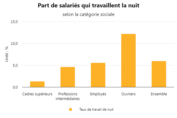 Les bataillons du travail de la nuit sont fournis par des métiers très hétérogènes, principalement peu qualifiés, qui vont des chauffeurs routiers aux policiers, en passant par les agents des services de santé. Le travail de nuit régulier est très rare chez les cadres supérieurs (1,3 %) mais atteint 12 % chez les ouvriers. Ces moyennes masquent des taux bien plus élevés, par exemple chez les ouvrières qualifiées (18 %).