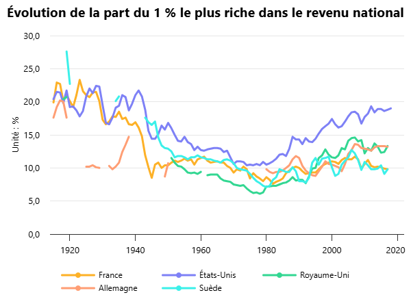 Dès les années 1920, la part du 1 % le plus riche s’effondre en Allemagne et en Suède. Les pertes dues à la Première Guerre mondiale, l’hyperinflation et la crise économique réduisent fortement la valeur des patrimoines et les revenus qui en découlent. En France, aux États-Unis et en Grande-Bretagne, la crise de 1929, suivie de la Seconde Guerre mondiale, ont le même effet.