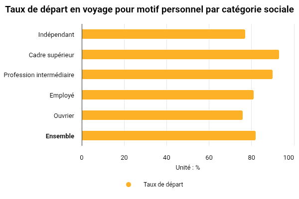 https://www.inegalites.fr/Voyages-l-empreinte-du-milieu-social - Reproduction interditeDepuis 20 ans, l’Insee ne mesure plus le taux de départ en vacances [1] des Français. Après des années d’interruption, l’institut publie toutefois de nouvelles données sur un sujet proche : les « départs pour motifs personnels ». Résultat : une fracture sociale marquée.