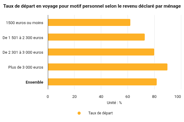 Selon l’Insee, huit Français sur dix sont partis en voyage en 2022. Il ne s’agit pas de vacances proprement dites, car il suffit de s’éloigner une seule nuit de son domicile pour être compté comme « partant » : un mois de congé à 10 000 km équivaut à un week-end chez des parents à 20 km… Même avec ce critère trop large, d’importants écarts sont constatés selon le niveau de vie : alors que 90 % des ménages dont le revenu est supérieur à 3 000 euros par mois sont partis dans l’année, c’est le cas de seulement 62 % de ceux qui vivent avec 1 500 euros ou moins [2].