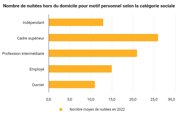 Derrière le niveau de revenus se cachent des inégalités profondes selon les milieux sociaux. Alors que 93 % des cadres supérieurs ont quitté leur domicile, seulement 76 % des ouvriers sont dans ce cas. De plus, les départs des uns et des autres n’ont rien à voir. En moyenne, les premiers ont passé 26 nuits à l’extérieur de leur domicile, contre 11 nuits pour les ouvriers. Ces derniers partent moins, mais aussi moins longtemps.