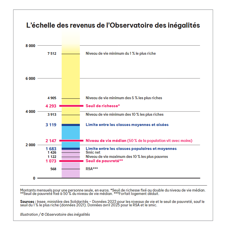 Les catégories aisées démarrent avec des revenus mensuels de 3 119 euros pour une personne seule, soit le seuil d’entrée des niveaux de vie les 20 % les plus élevés. L’Observatoire des inégalités fixe le seuil de richesse au double du niveau de vie médian, soit à 4 293 euros par mois après impôts pour une personne seule. L’échelle des niveaux de vie grimpe bien plus haut. À partir de 4 905 euros mensuels, on entre parmi les 5 % les plus riches. Ensuite, il faut percevoir au moins 7 512 euros pour appartenir au 1 % du sommet (donnée Insee 2021, dernière année disponible). Environ 630 000 personnes se situent au-dessus de ce seuil, et parfois très au-delà. Une personne sur 1 000 (le 0,1 % le plus riche) gagne plus de 19 500 euros par mois et une sur 10 000 (0,01 %) a un niveau de vie mensuel supérieur à 70 900 euros selon l’Insee. Des niveaux tellement élevés qu’on ne peut pas les représenter sur notre échelle.