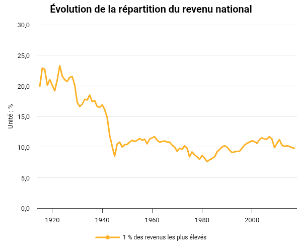 https://www.inegalites.fr/evolution-part-top-1-revenus - Reproduction interditeLes 10 % les plus riches reçoivent près d’un tiers du total des revenus en France [1], avant impôts et prestations sociales (données 2017). C’est beaucoup moins qu’au début du XXe siècle, quand ils en recevaient la moitié. Leur part s’est érodée lors des deux grandes guerres mondiales et sous l’effet de la crise des années 1930. Elle est remontée au cours des vingt premières années des Trente Glorieuses : la très forte croissance des revenus de cette période a d’abord profité aux plus aisés.