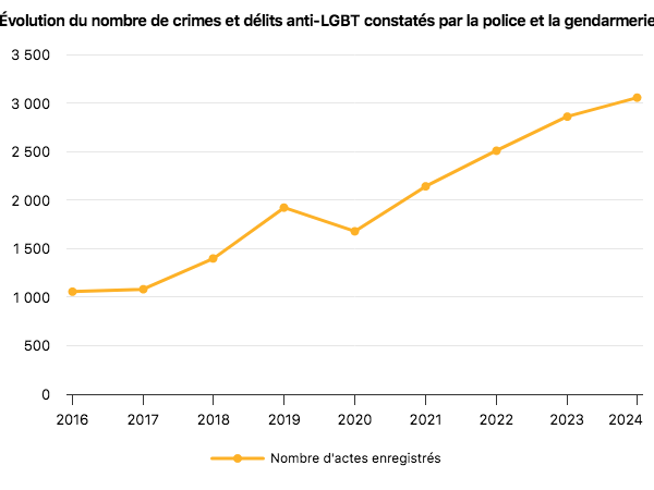 La police et la gendarmerie ont enregistré 3 000 crimes et délits homophobes et transphobes en 2024. Ce chiffre a triplé par rapport à 2016. Il faut interpréter cette hausse avec prudence, mais elle est inquiétante. Extrait du Centre d’observation de la société.
