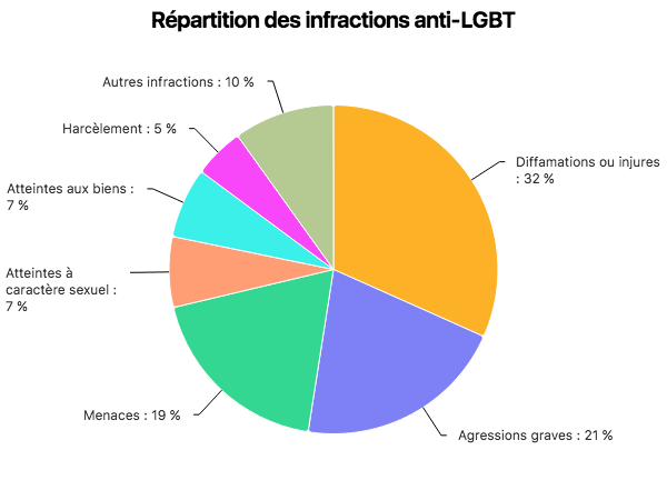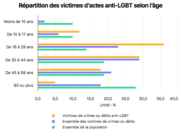 Les victimes d’actes anti-LGBT sont dans l’immense majorité des hommes (72 %), et bien plus souvent des jeunes, selon les données 2024 du ministère de l’Intérieur. La moitié ont moins de 29 ans, alors que c’est le cas de 31 % des personnes victimes de crimes et délits en moyenne. Seuls 5 % ont plus de 60 ans, contre 18 % de l’ensemble des victimes de crimes et délits. Les infractions les plus souvent citées sont majoritairement verbales : dans 32 % des cas il s’agit d’injures et pour 19 % de menaces. Dans 21 % des cas, il s’agit d’agressions graves.