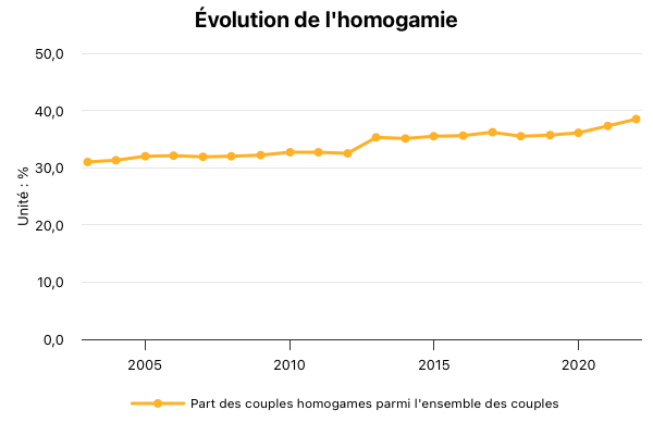 Lecture : en 2022, 38,5 % des couples sont composés de deux personnes du même milieu social.