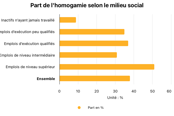 Plus on s’élève dans la hiérarchie sociale, plus les couples se forment entre personnes de milieu comparable. La moitié des personnes qui disposent d’un emploi dits « de niveau supérieur » (comme les cadres) vivent avec un partenaire du même niveau social, contre un tiers pour les emplois d’exécution peu qualifiés (ouvrier à la chaîne ou caissière par exemple). Parmi les salariés, les classes supérieures ont une probabilité cinq fois plus grande d’être en couple homogame que celle des autres catégories. En bas de l’échelle sociale, cette probabilité est 2,5 fois plus élevée. L’homogamie est encore plus importante chez les indépendants (souvent des conjoints qui travaillent ensemble), mais ils ne représentent que 4 % des couples.