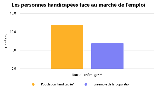 12 % des personnes reconnues handicapées étaient au chômage en 2023, 1,7 fois plus que la moyenne nationale. Près des deux tiers des travailleurs handicapés sont employés et ouvriers, contre à peine la moitié de la population en emploi.