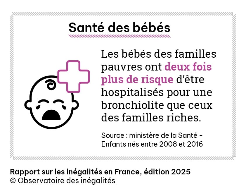 Quant à l’air extérieur, la cartographie des pollutions ne recoupe pas (ou pas partout) celle de la pauvreté. Mais, où que l’on vive, la pollution a plus d’effets néfastes sur la santé des plus modestes. Les bébés des familles pauvres ont ainsi un risque deux fois plus grand d’être hospitalisés pour une bronchiolite que ceux des familles les plus riches.