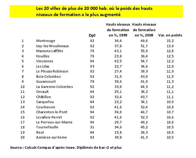 Pour l’ensemble de la France, la part des diplômés de niveau bac+2 et plus (les diplômés de l’enseignement supérieur) a augmenté de 18 à 23,8 % entre 1999 et 2008, selon le recensement de la population. Si l’on prend toutes les communes de plus de 1 000 habitants, Fourqueux (Yvelines, moins de 5 000 habitants) est celle qui connaît la plus forte concentration de diplômés en 2008 : 66 % des habitants sont dans ce cas, soit presque trois fois la moyenne du pays, en hausse de 9 points depuis 1999. Parmi les villes de plus de 5 000 habitants, les communes de Montrouge (47 000 hab.) et Issy-Les-Moulineaux (120 000 hab.) en banlieue parisienne sont celles où la croissance a été la plus vive (+15 et +14 points) : la part des diplômés du supérieur y atteint 50 % en 2008, soit deux fois plus que la moyenne nationale.