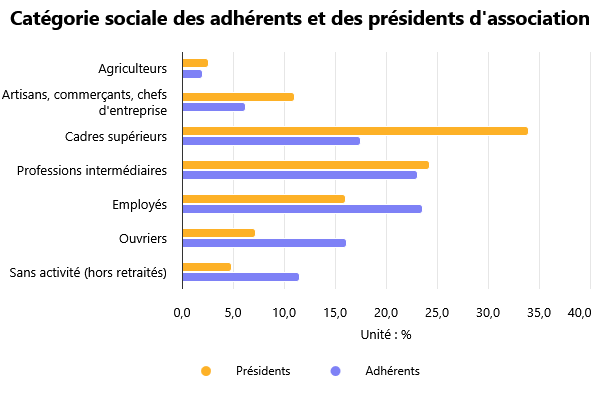 https://www.inegalites.fr/Les-associations-sont-de-plus-en-plus-elitistes - Reproduction interditeSouvent présentés comme un modèle d’ouverture et de démocratie, les organes de direction des associations – et en particulier leur présidence – demeurent en pratique socialement très élitistes, selon une enquête menée par le Laboratoire d’économie et de management de Nantes-Atlantique et le Centre de recherche sur les associations [1]. Les cadres supérieurs sont deux fois plus représentés parmi les présidents d’association (34 %) que parmi leurs adhérents (17,5 %). Inversement, les ouvriers représentent 16 % des adhérents mais seulement 7,2 % des présidents (données 2017).