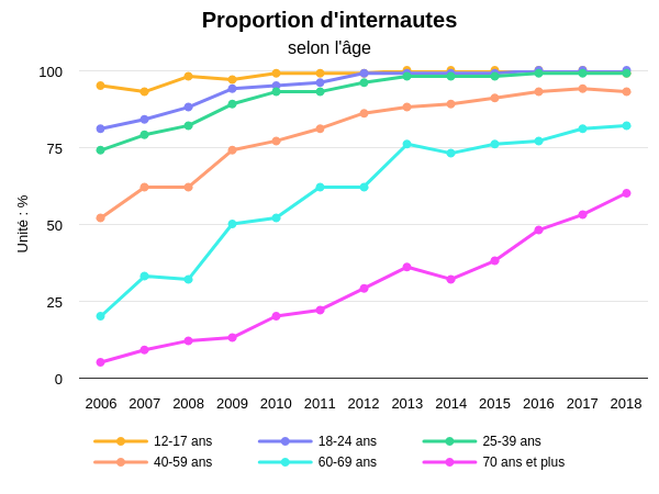 11 % des Français (6,4 millions de personnes) n’utilisent jamais Internet contre 45 % en 2006. Les inégalités liées à l’âge ont diminué : en 2018, 18 % des 60-69 ans, ainsi que 40 % des 70 ans et plus, ne sont pas connectés. Les écarts selon le niveau de diplôme et le revenu se réduisent également, mais à un rythme plus lent : 14 % des bas revenus, 16 % des classes moyennes inférieures n’utilisent pas à Internet. Le taux atteint même 46 % chez ceux qui n’ont aucun diplôme.