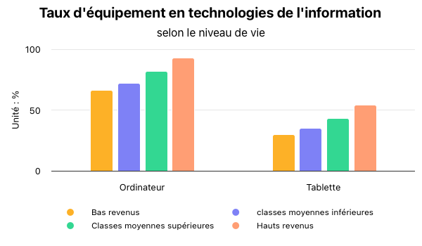 La possession d’un ordinateur ou d’une tablette reste fortement liée au niveau de revenu et de diplôme. Ainsi 93 % des hauts revenus sont équipés d’un ordinateur contre 66 % des bas revenus. Il faut noter que l’équipement en ordinateur et en tablette diminue avec l’essor des smartphones, notamment chez les 18-24 ans.