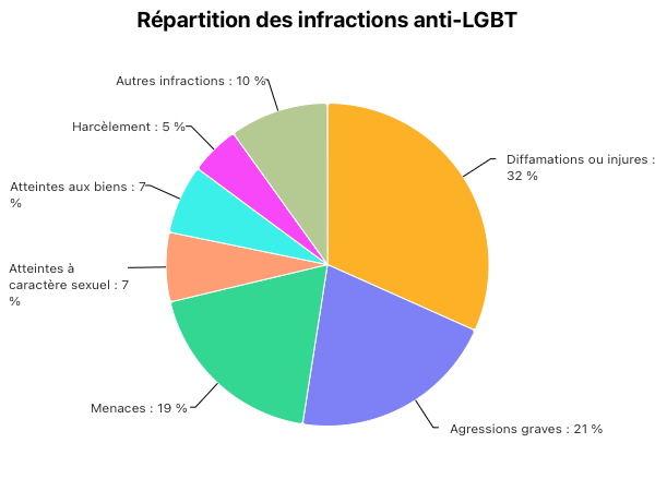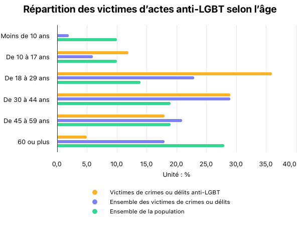 Les victimes d’actes anti-LGBT sont dans l’immense majorité des hommes (72 %), et bien plus souvent des jeunes, selon les données 2024 du ministère de l’Intérieur. La moitié ont moins de 29 ans, alors que c’est le cas de 31 % des personnes victimes de crimes et délits en moyenne. Seuls 5 % ont plus de 60 ans, contre 18 % de l’ensemble des victimes de crimes et délits. Les infractions les plus souvent citées sont majoritairement verbales : dans 32 % des cas il s’agit d’injures et pour 19 % de menaces. Dans 21 % des cas, il s’agit d’agressions graves.